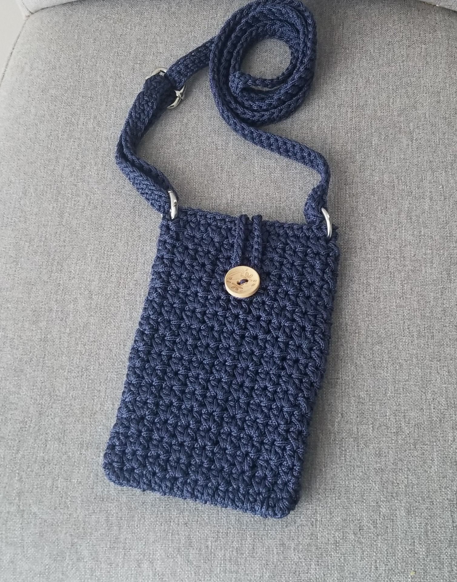 Pochette smartphone réalisée au crochet avec un fil synthétique BLEU MARINE. Sangle réglable.