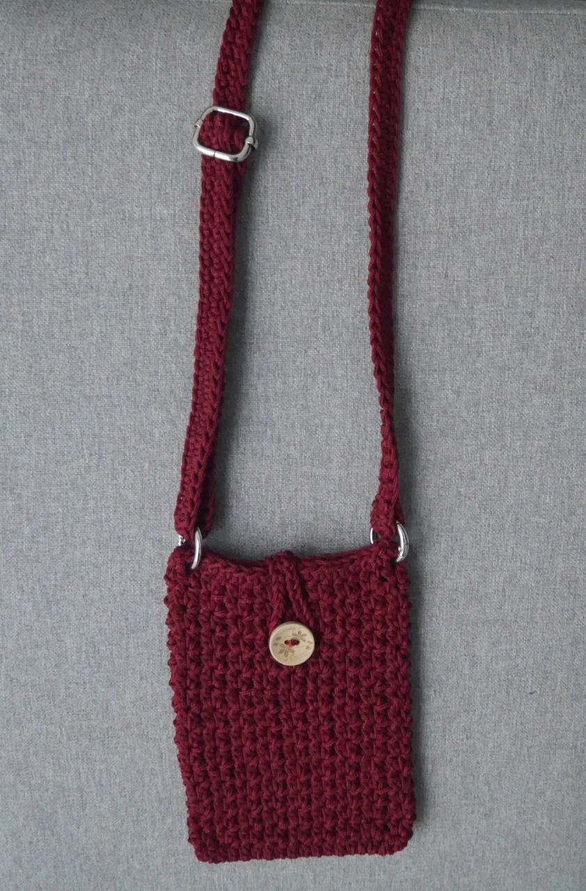 Pochette téléphone réalisée au crochet avec un fil synthétique BORDEAUX. Sangle réglable.