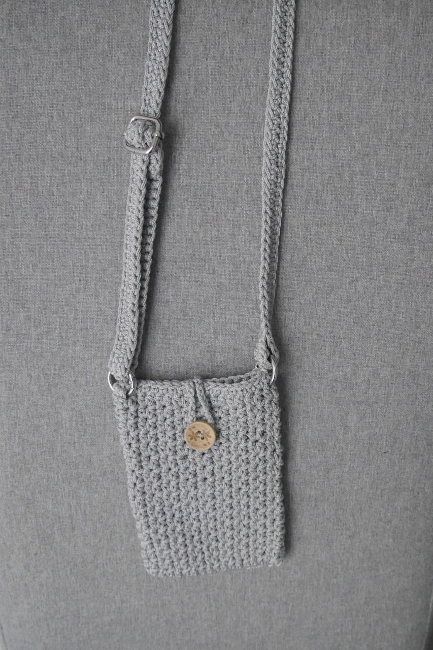 Pochette téléphone réalisée au crochet avec un fil synthétique GRIS perle. Sangle réglable.