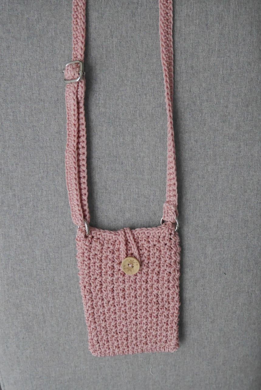 Pochette téléphone réalisée au crochet avec un fil synthétique ROSE poudré. Sangle réglable.