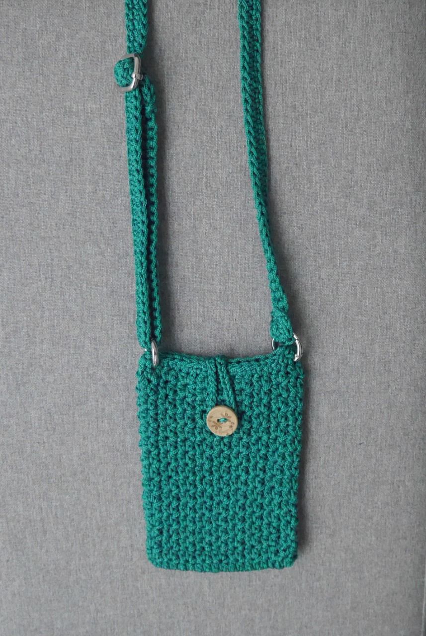Pochette téléphone réalisée au crochet avec un fil synthétique VERT émeraude. Sangle réglable.