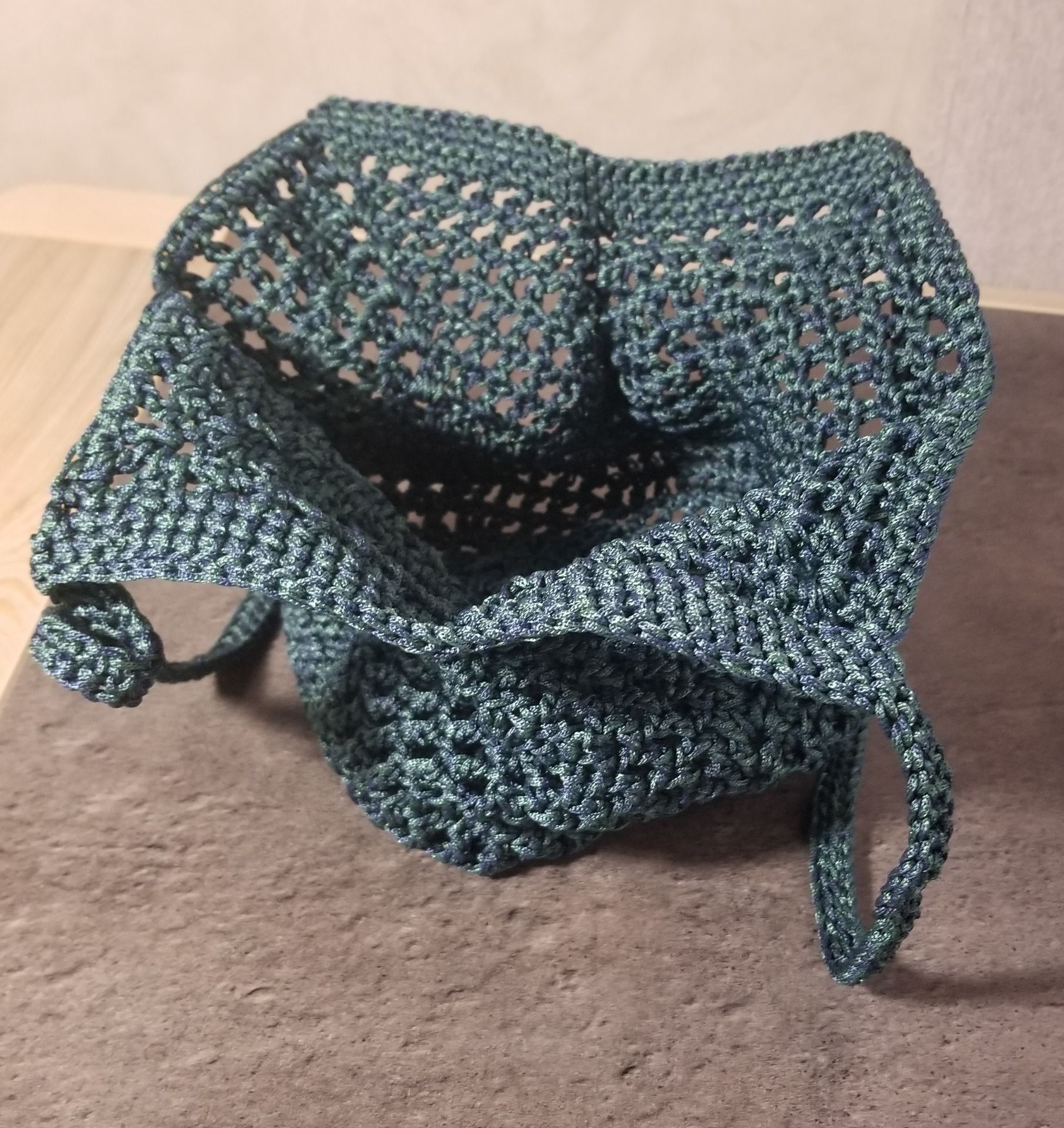 Sac au crochet style tulipe réalisé au point filet avec un fil synthétique vert/bleu chiné.