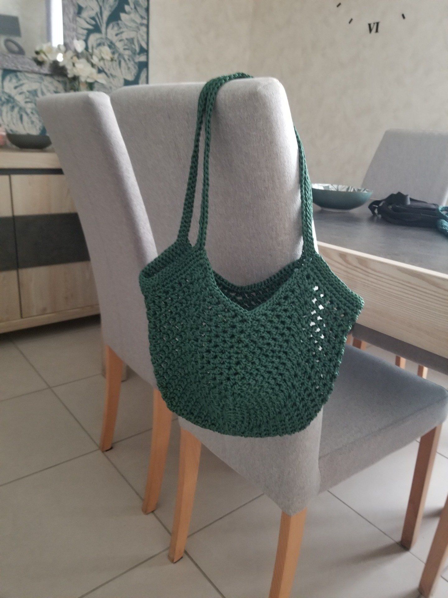 Sac au crochet style tulipe réalisé au point filet avec un fil synthétique vert émeraude
