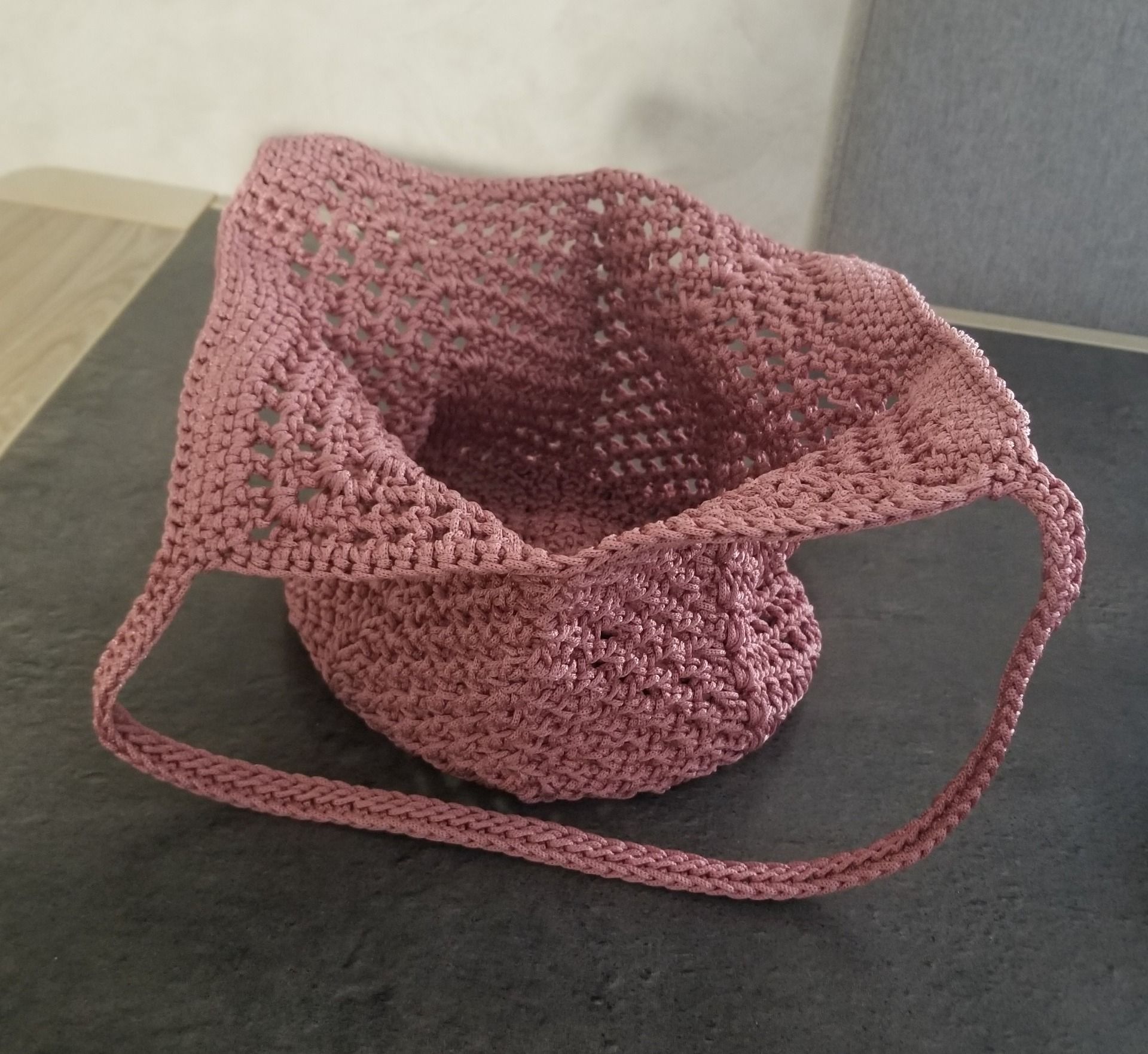 Sac au crochet style tulipe réalisé au point filet avec un fil synthétique vieux rose.