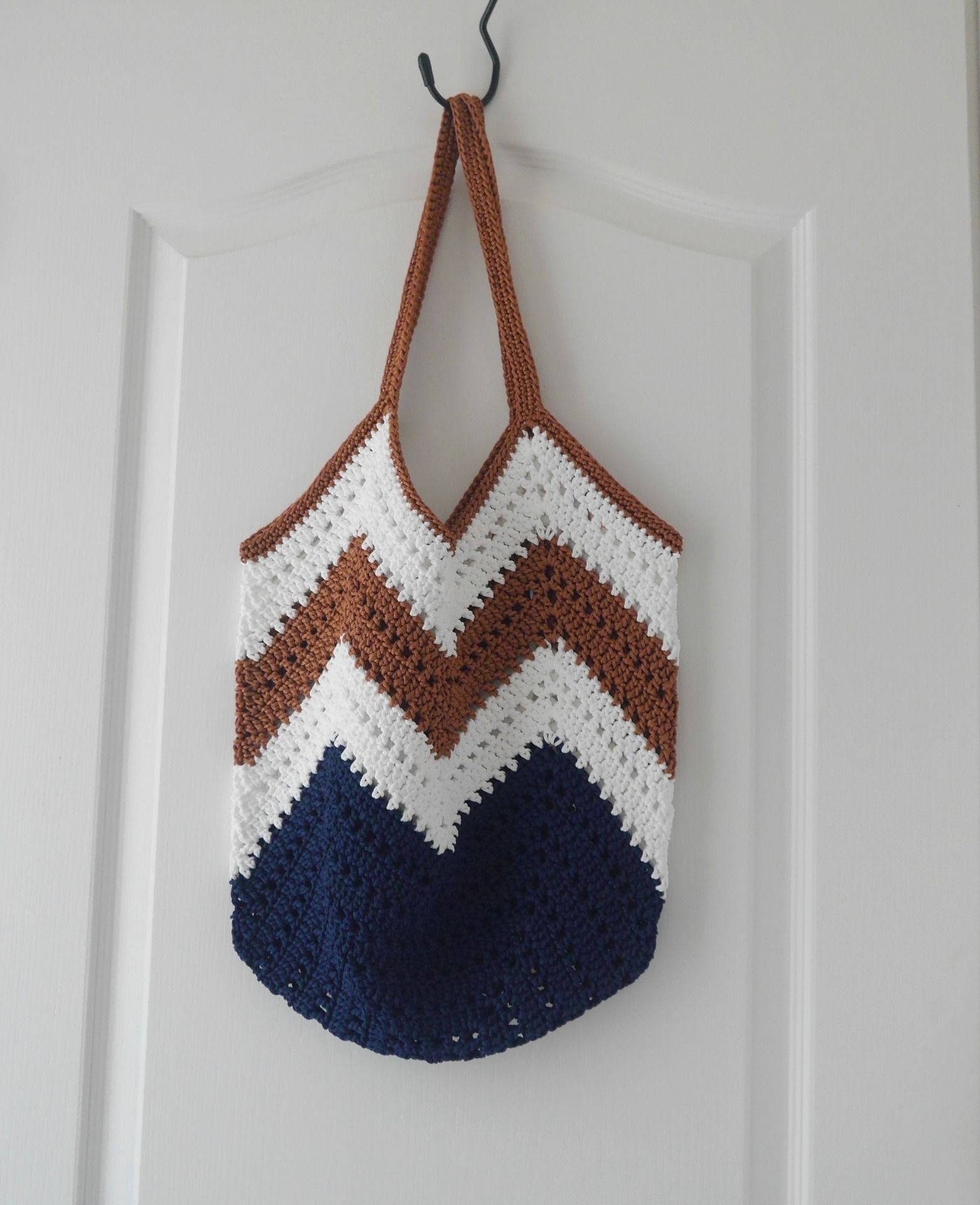 Sac de plage au crochet, fil synthétique marine, blanc et rouille. Style bohème chic