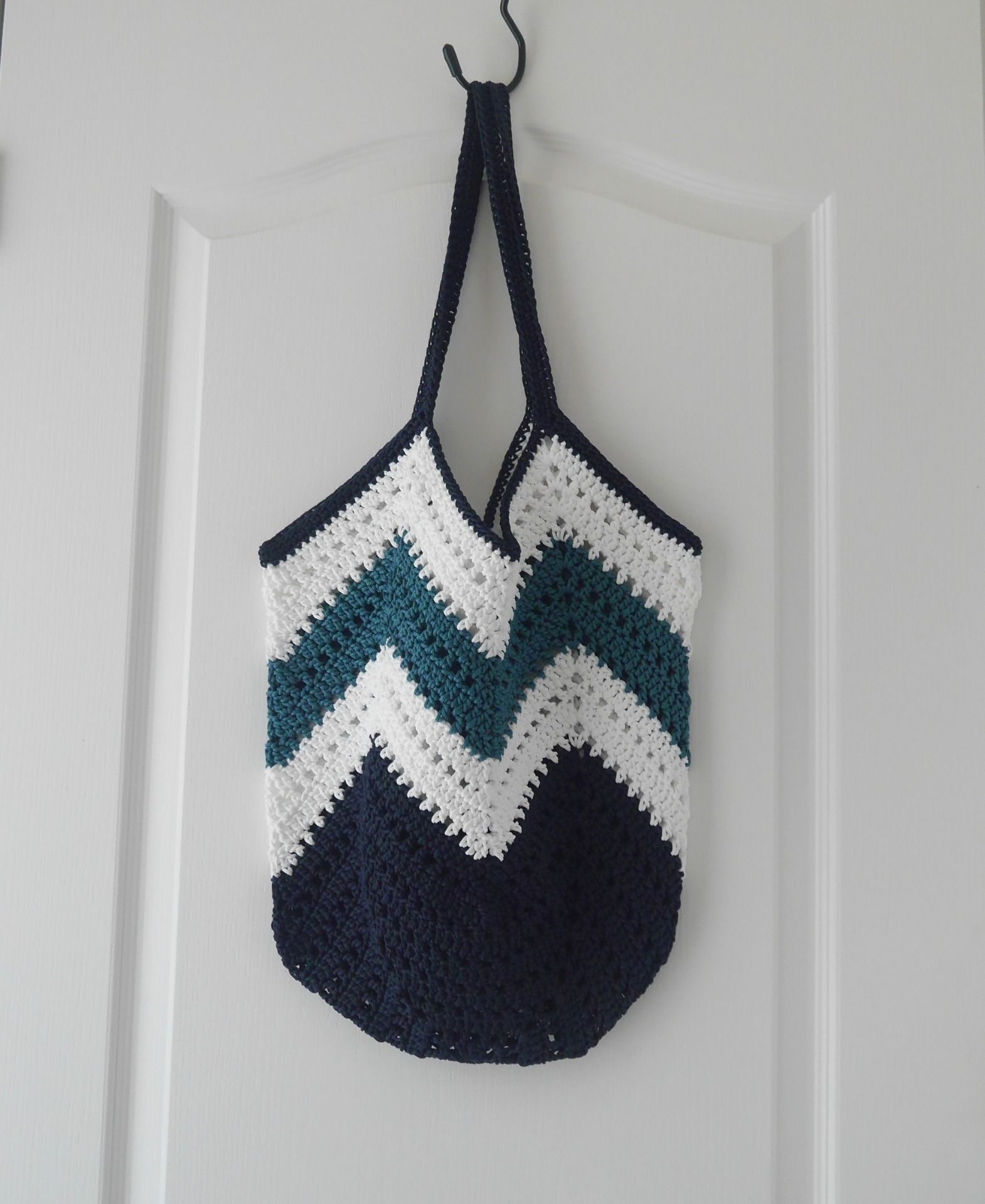 Sac de plage au crochet, fil synthétique marine foncé, blanc et bleu canard. Style bohème chic
