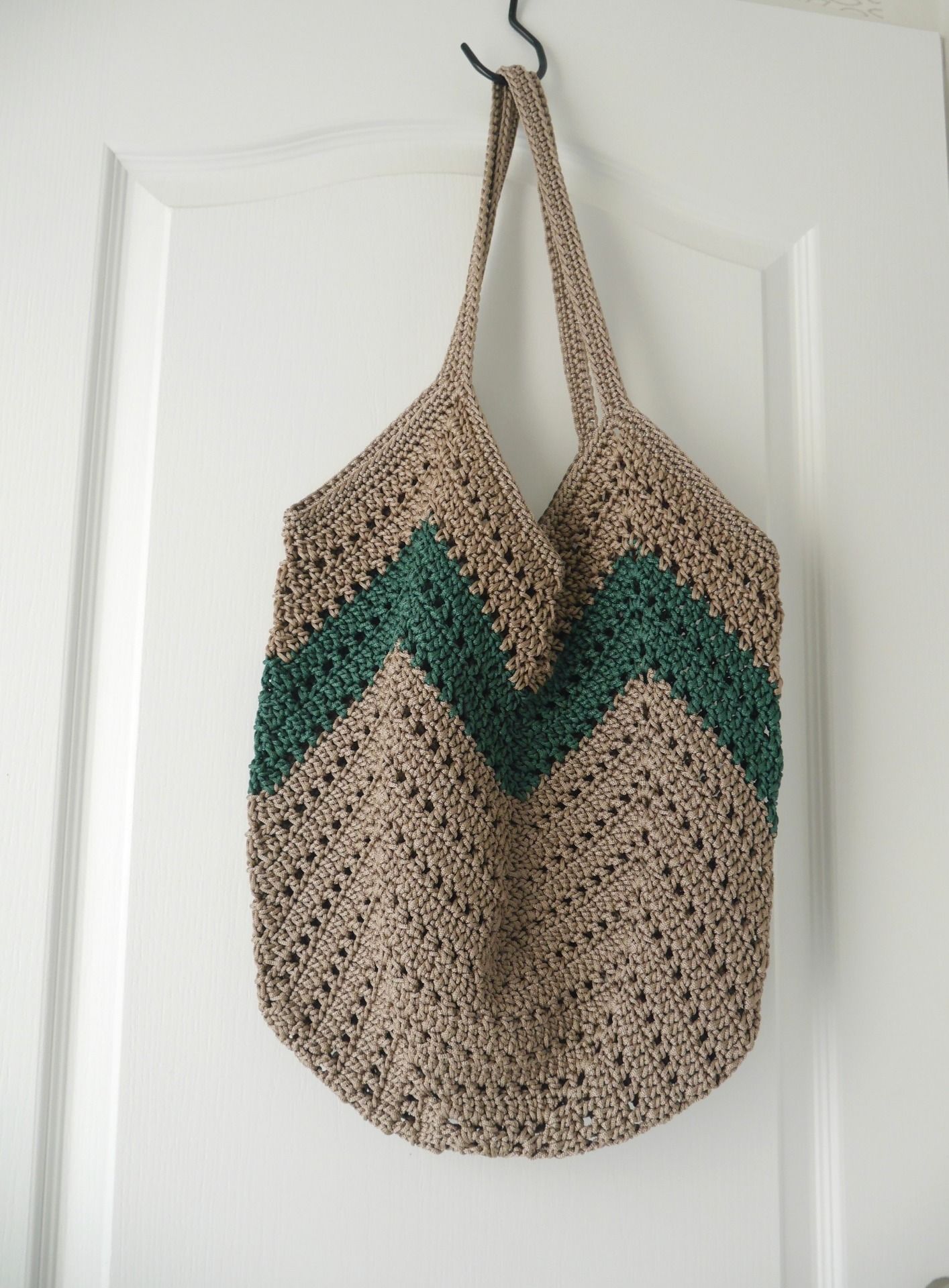 Sac au crochet MARRON clair et VERT émeraude style "sac de plage" réalisé avec un fil synthétique (polypropylène) de haute qualité durable et recyclable.