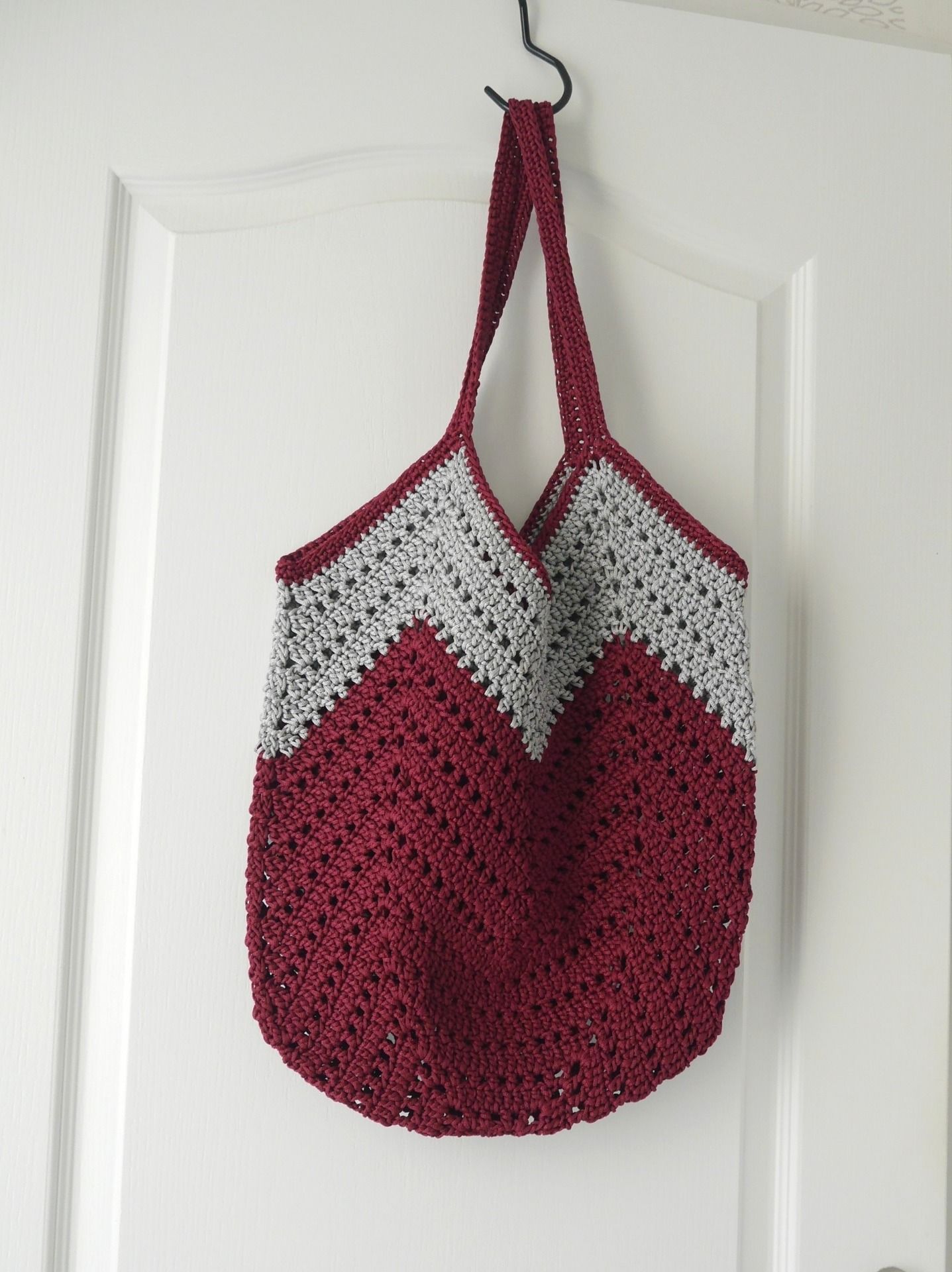 Sac au crochet rouge foncé et gris perle style sac de plage réalisé avec un fil synthétique (polypropylène) de haute qualité durable et recyclable.