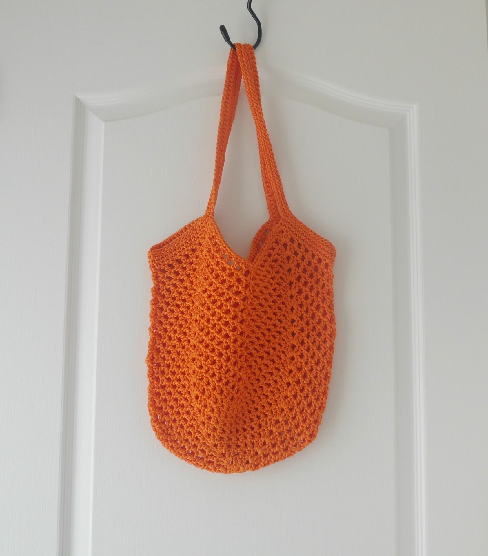 Sac au crochet style tulipe réalisé au point filet avec un fil synthétique orange.