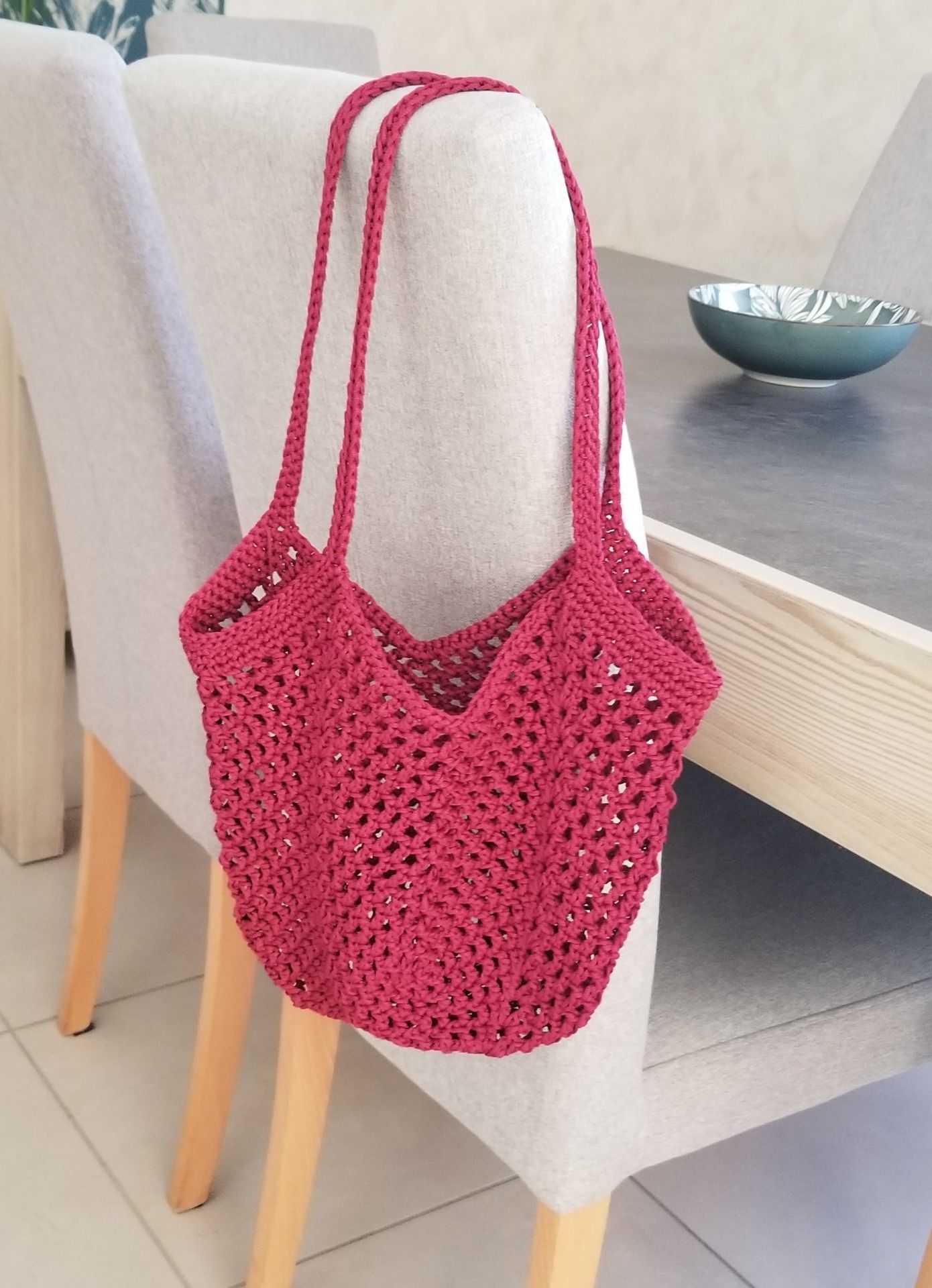 Sac au crochet style tulipe réalisé au point filet avec un fil synthétique ROUGE magenta.